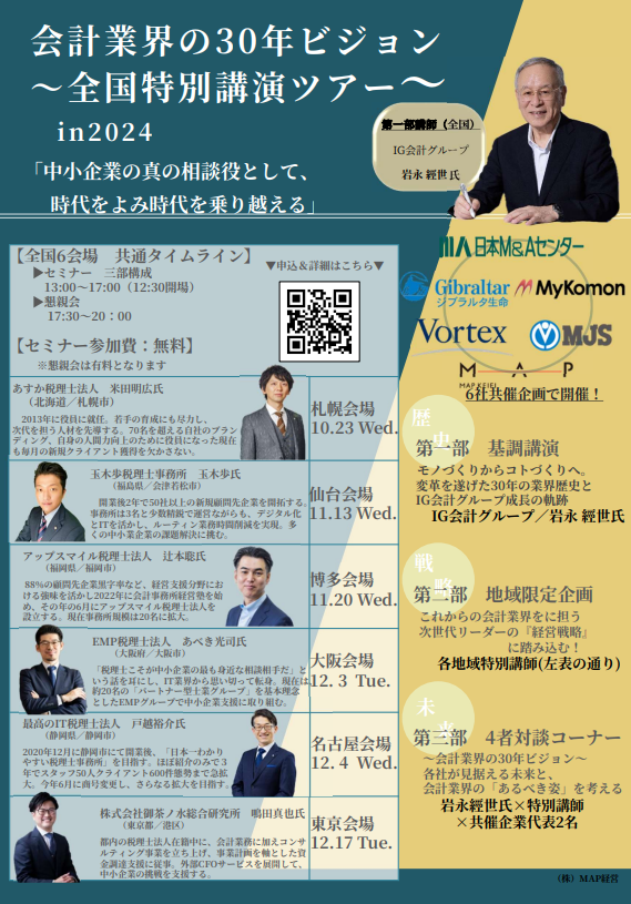 本セミナーは「会計業界を担う次世代リーダー」をテーマに、㈱MAP経営・ジブラルタ生命保険㈱・㈱名南経営ソリューションズ・㈱Vortex・㈱日本M&Aセンター・㈱ミロク情報サービスの6社共催にて開催されました。